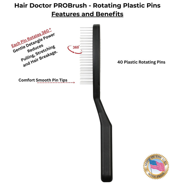 PRO-Brush with smooth rotating plastic pins and comfort tips reduces pulling stretching and breakage to gently detangle wet and dry hair. Excellent for chemically treated, thinning, fragile, delicate hair and tender scalps. Model# TH906PROBrush/Plastic