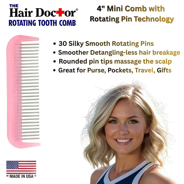 4" Hair Doctor Mini has 30 silky smooth rotating pins for quick touch ups and detangling. Perfect for detangling hair after swimming and workouts. Great size for Travel, Purses, Pockets, Backpacks and Kids. Model #TH416
